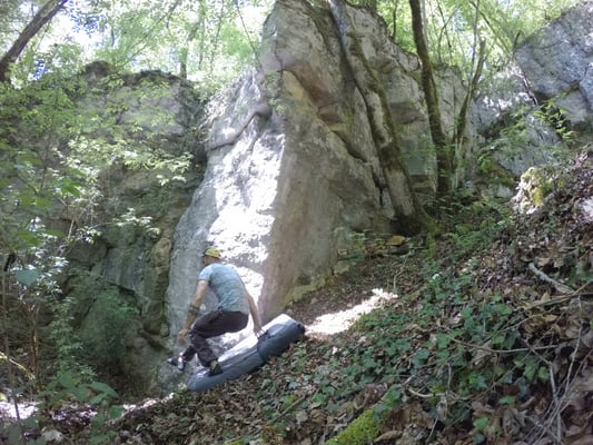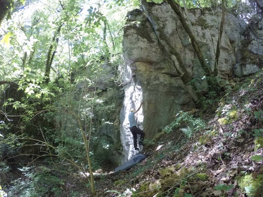 Eigentlich bin ich im Sommer selten zum Bouldern im Basler Jura unterwegs. Aus purer Neugier habe ich aber dann doch noch einen kurzen Stop in der Schachlete eingelegt. das eine Crashpad, welches ich immer im Auto mit dabei habe, reichte aber nicht aus. Das erste Projekt, über das ich gleich zu Anfang stolperte, benötigte nämlich ein bisschen mehr. Diese Ecke habe ich im Boulderführer nicht gefunden, obwohl sie gleich neben einem markierten Spot ist. Auch am Fels waren keinerlei Spuren zu sehen. Im gegenteil, er war noch total verkrustet. Natürlich habe ich gleich los probiert und wurde nicht enttäuscht.