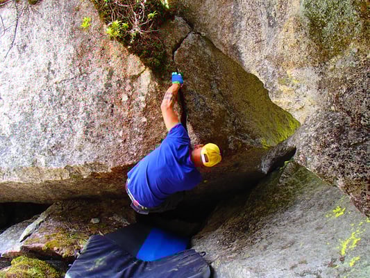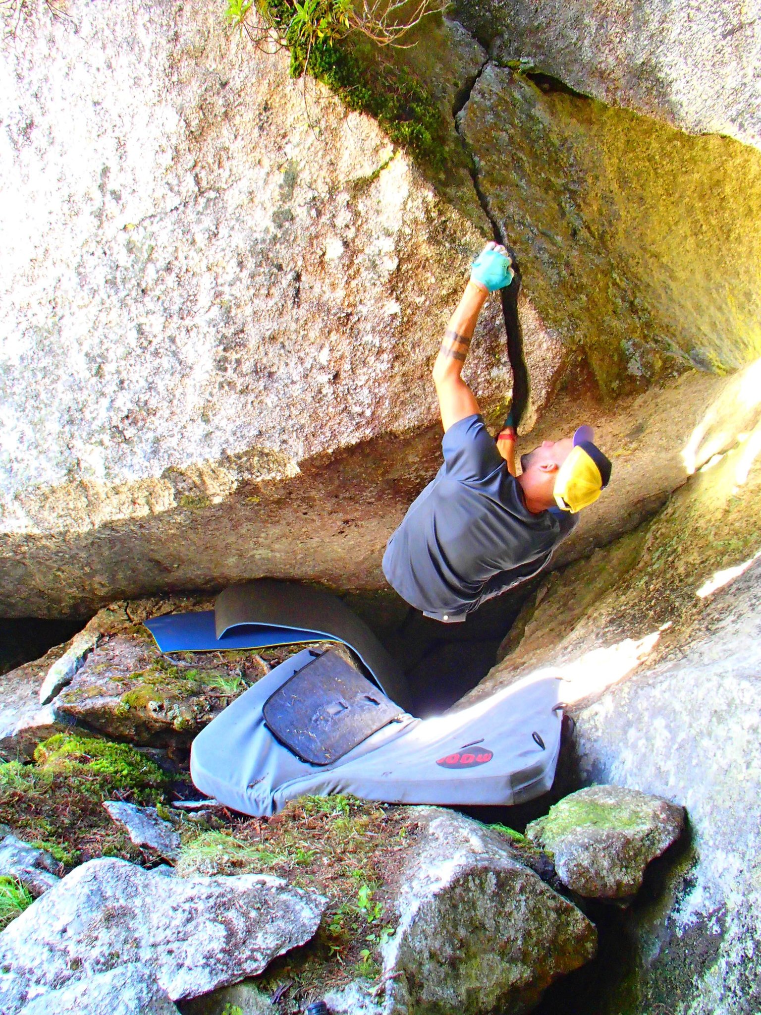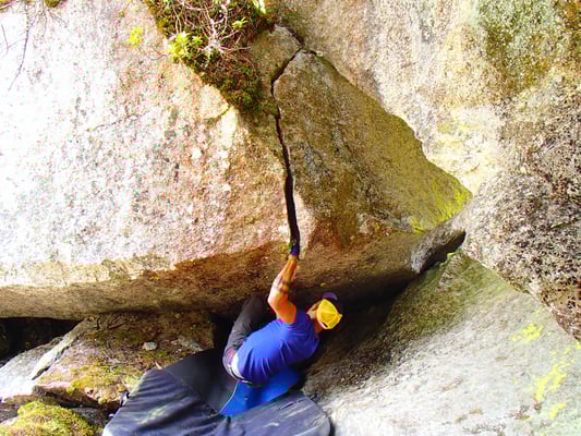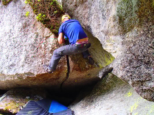 Bitterzart beschreibt diesen Riss sehr genau. Wer denkt, die wenigen Züge schaffe man auch noch ohne Tape, der wird sehr schnell eines besseren belehrt. leider kann ich ihn mit meinen langen Beinen nicht ganz von unten bouldern, ein  Felsbrocken versperrt mir den Weg... Aber das ist Nebensache. Die einzelnen Züge im Oberen Bereich haben nämlich schon genug Pfeffer drin!