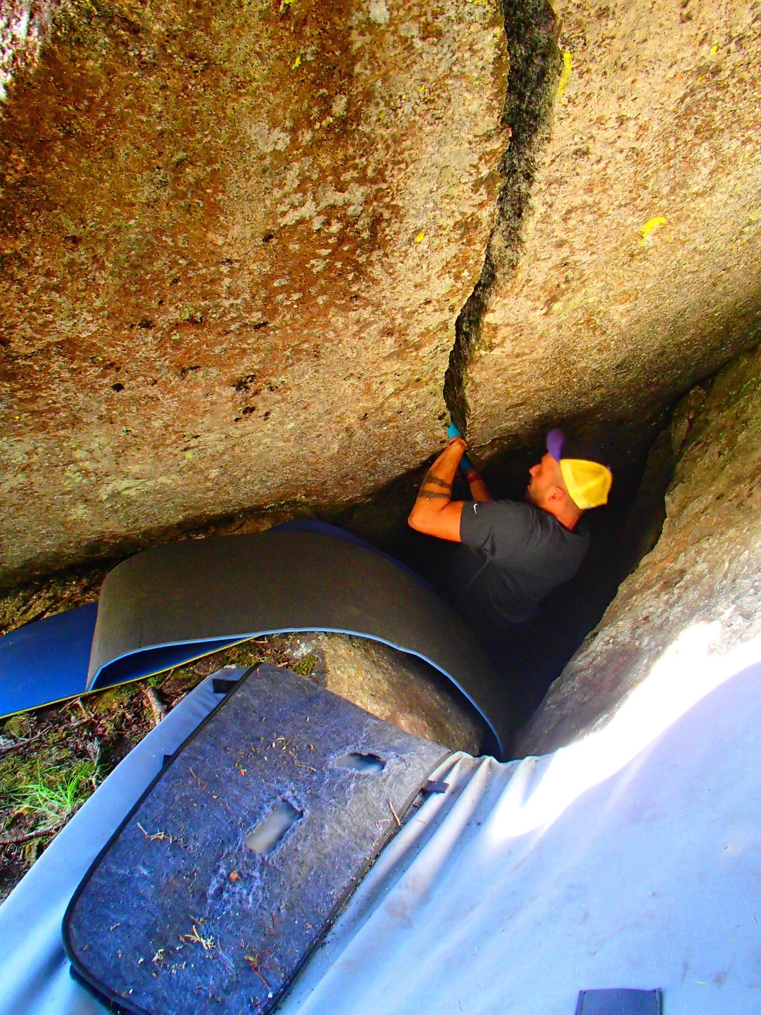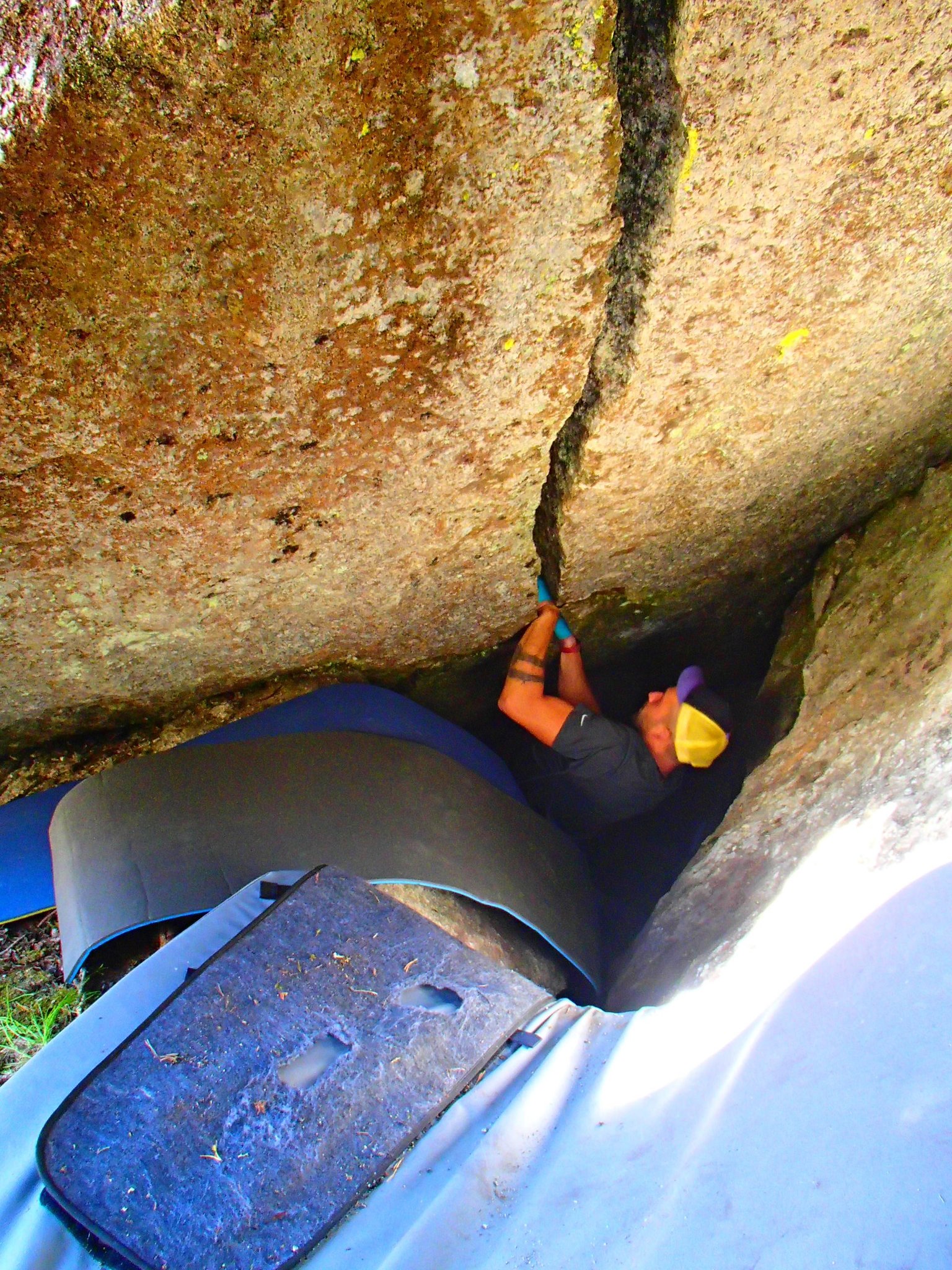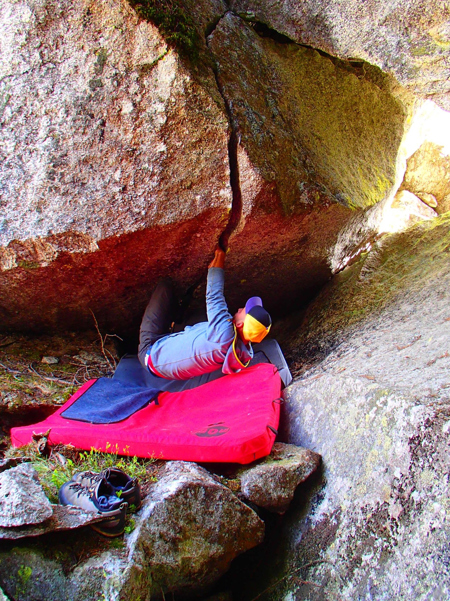 Heute standen ganz andere Blöcke auf dem Programm! Auf dem Weg zur Feuerstelle musste ich natürlich noch beim "Bitterzarten Riss" vorbei. Dieser Brocken lässt mir einfach keine Ruhe und so musste ich auch dieses Mal versuchen, das Ding mit meinen Beinen weg zu drücken. Und siehe da: er bewegte sich zum ersten Mal. Stück für stück drückte ich ihn zur Seite. Und dann verkeilte er sich erneut und klemmte unglücklicherweise meinen Fuss gleich noch mit ein. Für einen kurzen Moment dachte ich, es ergehe mir wie in 127 Hours. Aber ich hatte ihn dann doch schon nach 127 Sekunden an einem Stück wieder frei! zum Glück! bis auf Schmerzen in der Achillessehne, bin ich noch einmal unbeschadet davon gekommen. Ein Hammer steht jetzt zu oberst auf meiner Packliste und mit ihm die Hoffnung, den Riss ganz frei zu bekommen :)