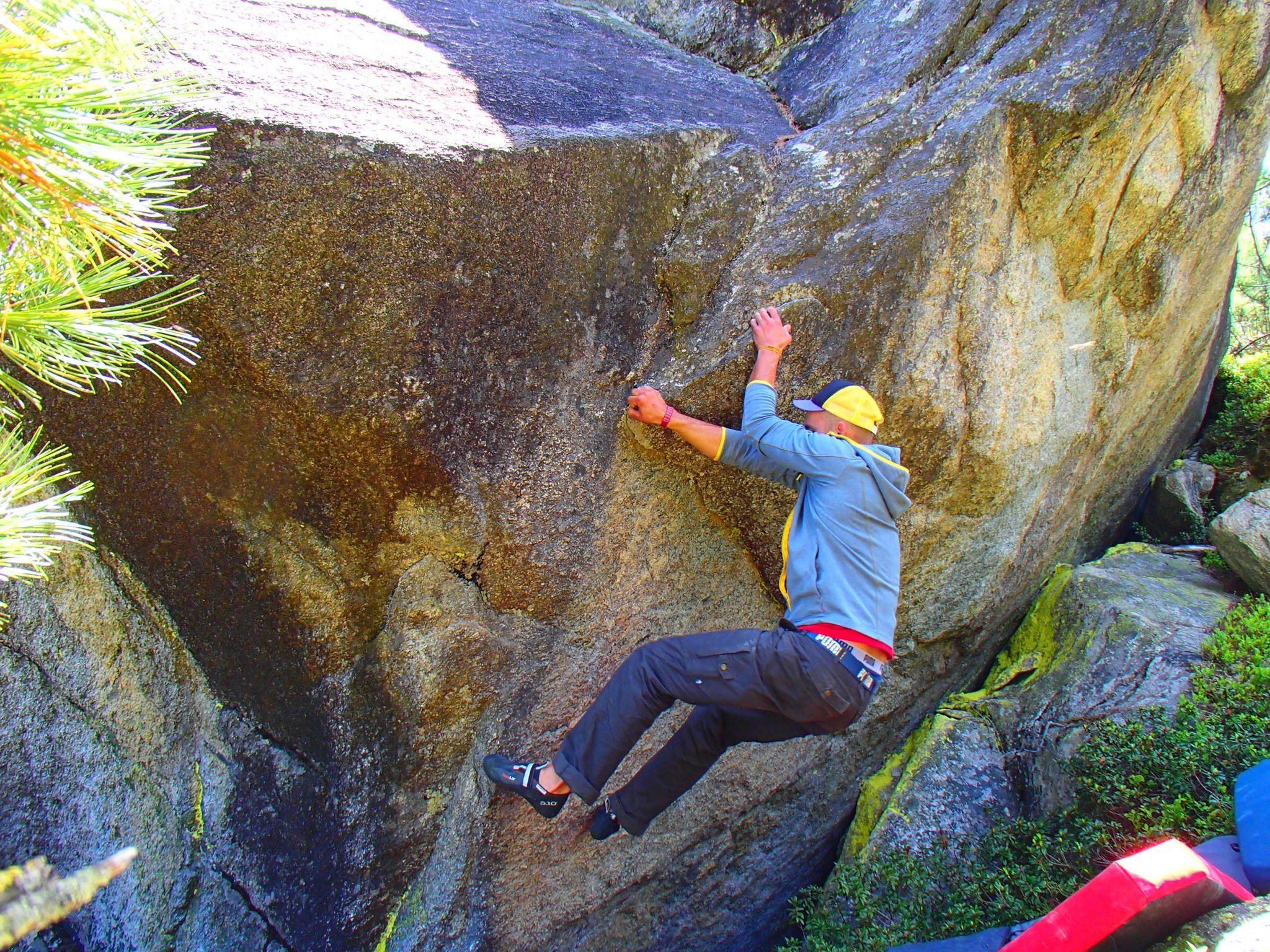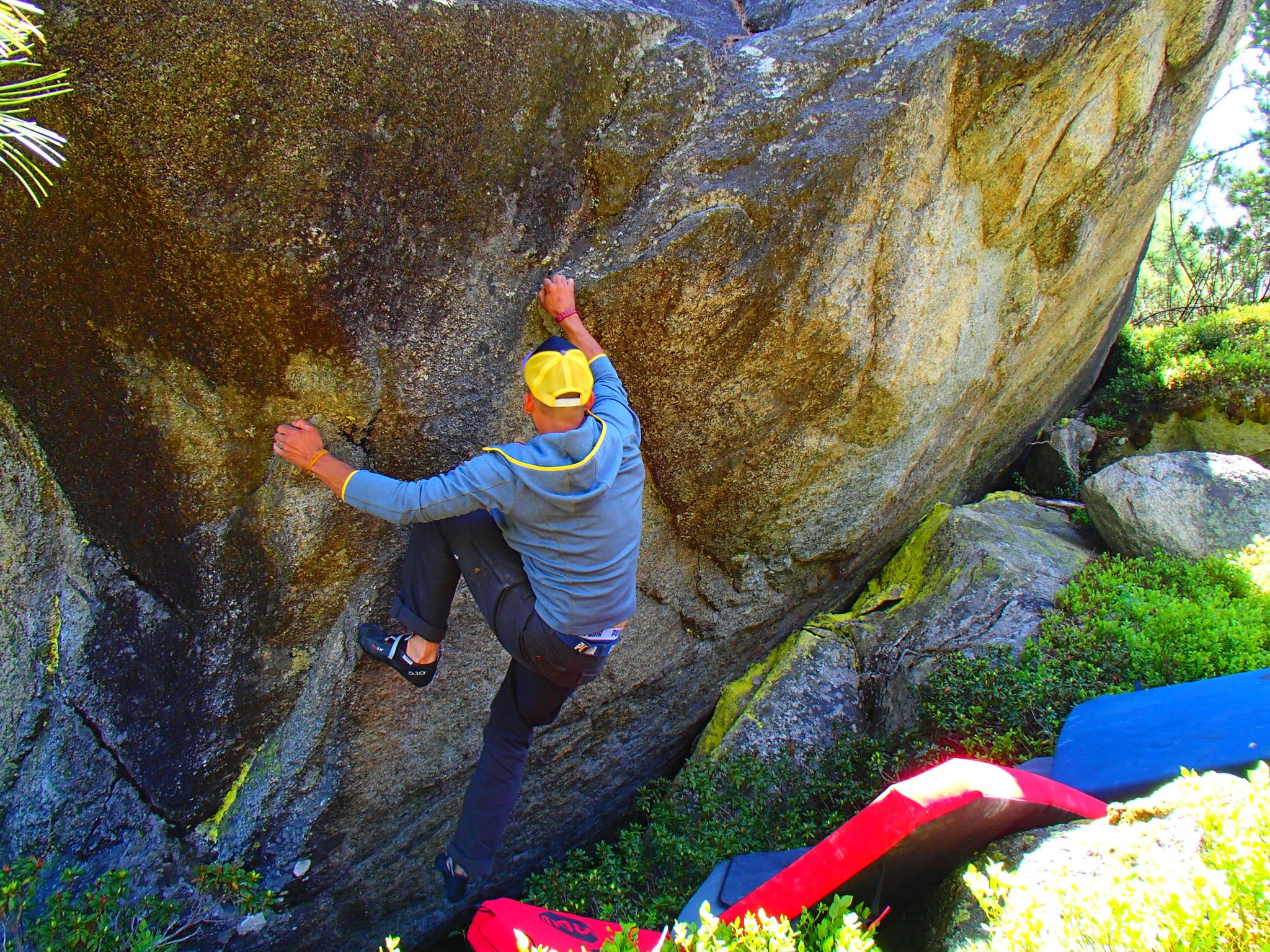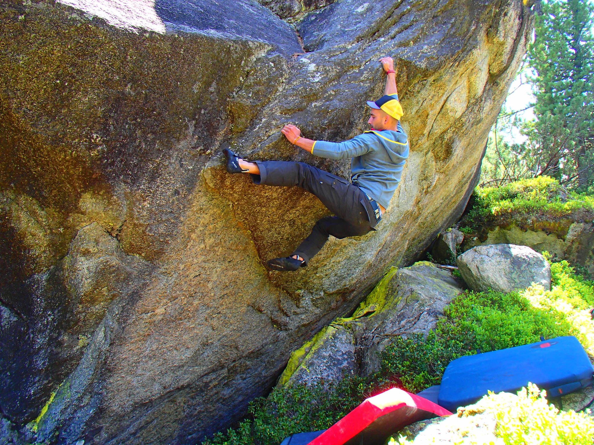 Einer musste den Anfang machen, Blöcke dazu gibt es dort genug. Aber welcher sollte dazu auserwählt werden? Egal, beim erst besten die Matratzen hin werfen und los Bouldern. Zuerst mussten wir aber doch noch den Hüter des EIS dazu überreden den Bolck frei zu geben.