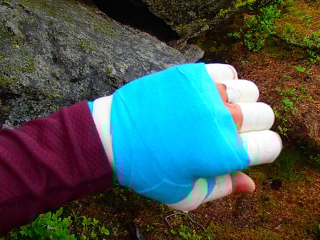 Handgelenk und Daumen können an den Enden noch zusätzlich mit klassischem Tape fixiert werden.